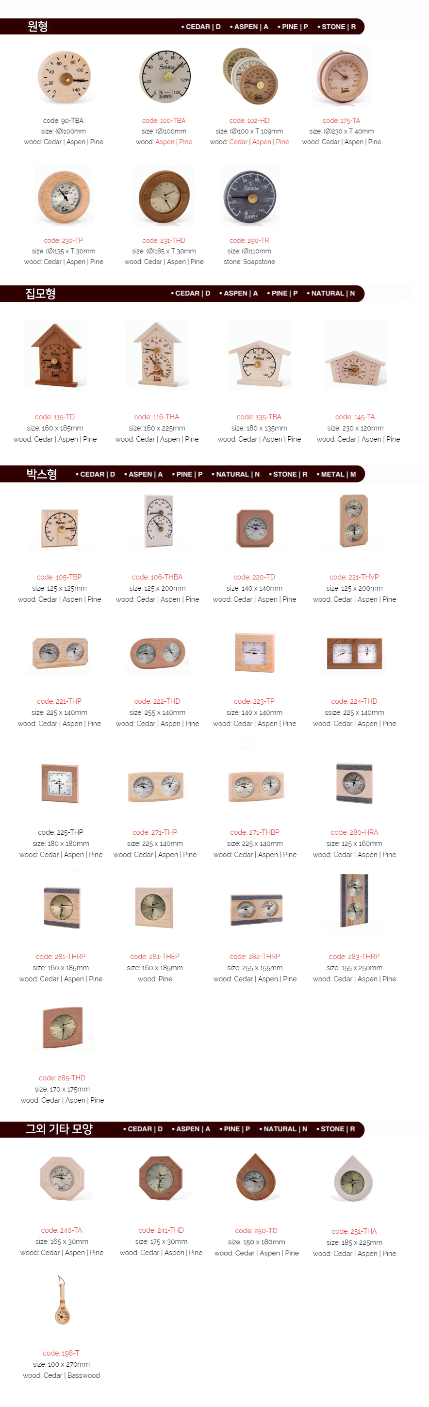 온도계와 습도계는 시더, 아스펜, 파인우드 및 옥석으로 제조되거나 금속 또는 석재로 다양한 재료, 디자인으로 제작되었습니다.