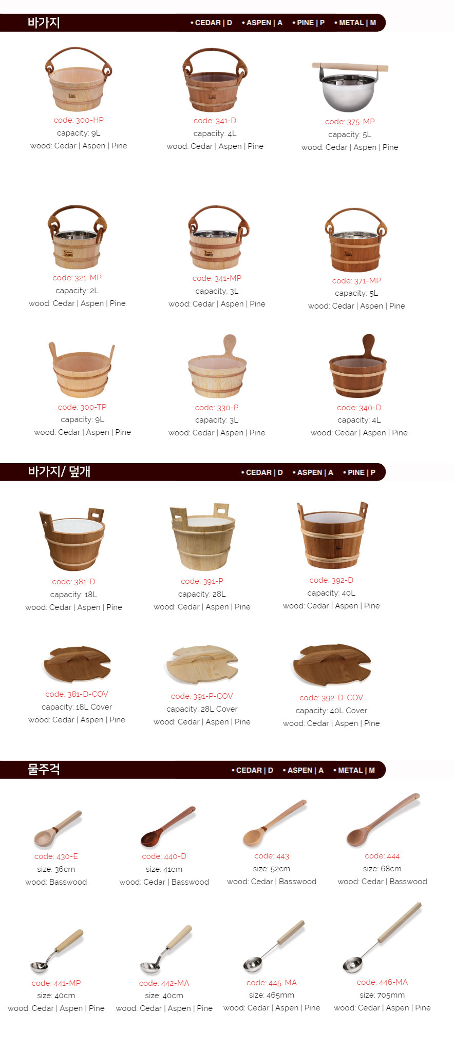 물통은 사우나를 하는데 있어 중요한 도구입니다. 물통은 다양한 디자인 및 모양이 있습니다. 등나무 손잡이, 이중 핸들, 스테인리스 통 등 여러 유형의 제품들이 있습니다.