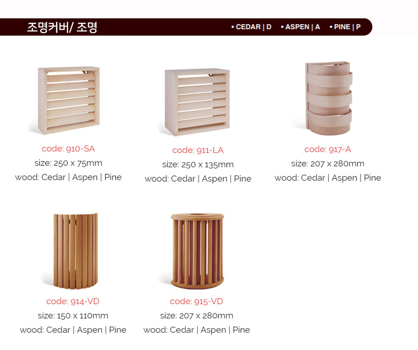 적절한 조명의 선택으로 사우나의 편안하고 따뜻한 인테리어를 구현해 보세요. Cedar, Aspen or Pine 3가지 색상이 있으며, 조명은 두 개의 다른 케이스로 되어 있습니다.