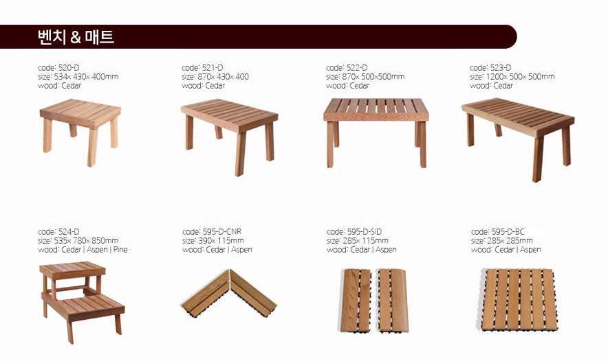 사우나룸 안에서 사용이 가능한 다양한 이동식 벤치와 연결식 매트